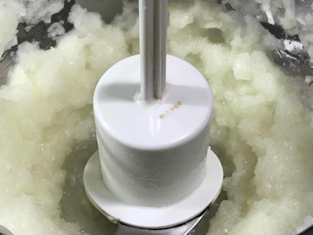 2 sm. yellow onions – cut ends off, cut in half, peel, cut in half again, then process till snowy in food processor