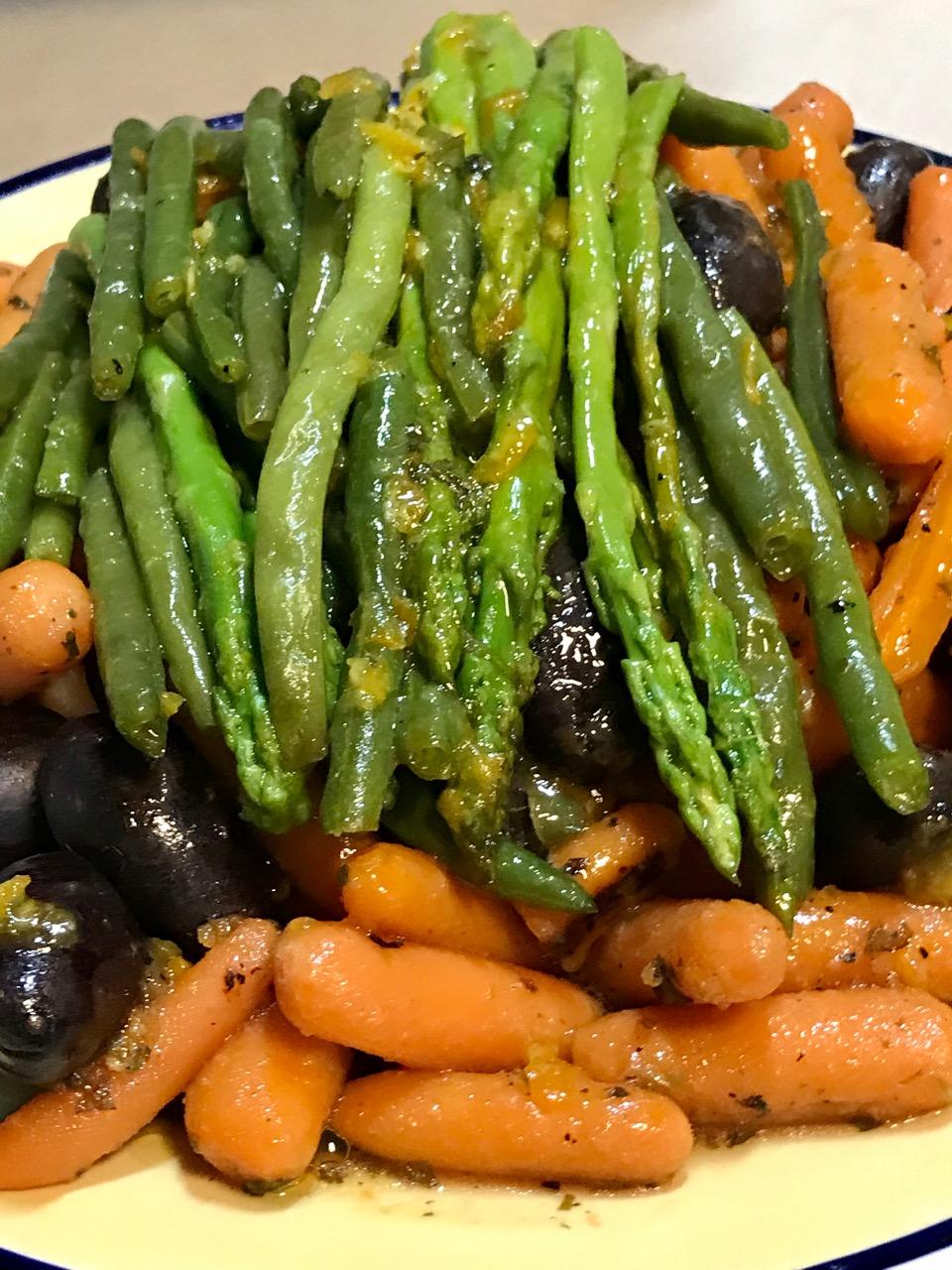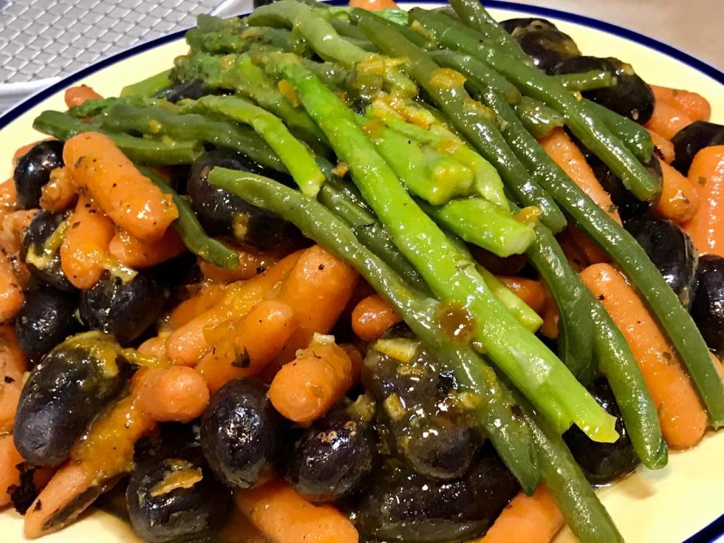Green Orange Purple. Asparagus and green beans cooked till tender, no seasoning except the salted water! Baby Purple Potatoes and baby carrots. Coated with agar gel as an oil or melted margarine replacement. Tossed with cilantro and garlic. Serve with an orange marmalade glaze. No oil please! I’m feasting!