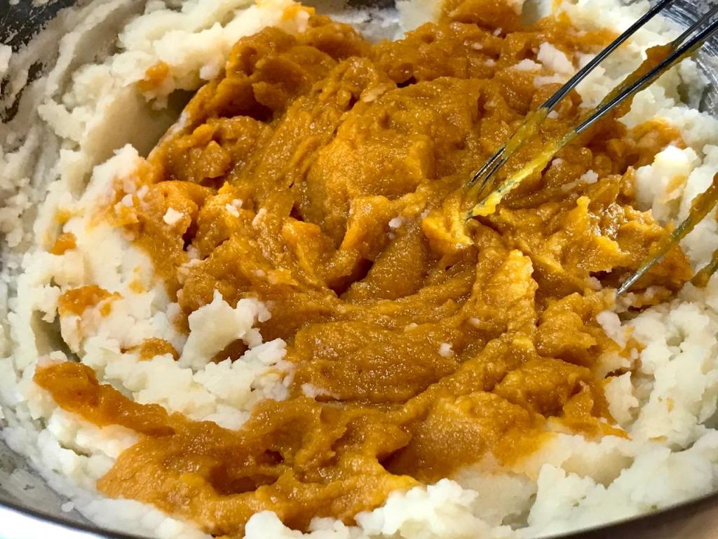 Add heated pumpkin, whisking to totally incorporate into the potato mash.