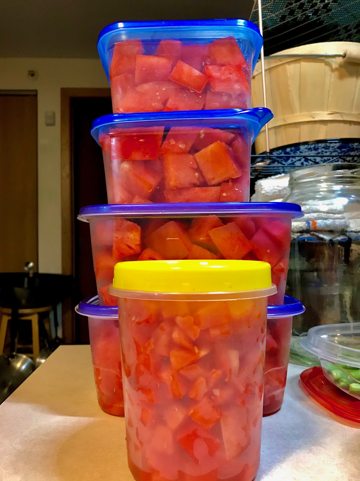 WATERMELON SEASON IS HERE! And Steve loves watermelon. So he brings a twenty-five pounder home a couple days ago and I panicked running to the refrigerator figuring out how I’m going to process the dang thing and fit it all into our apartment size cold air pantry!
