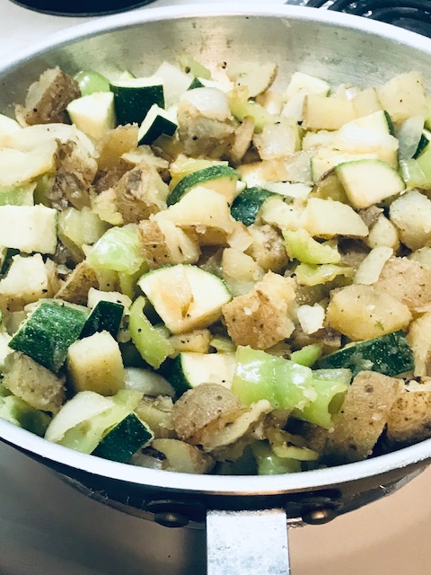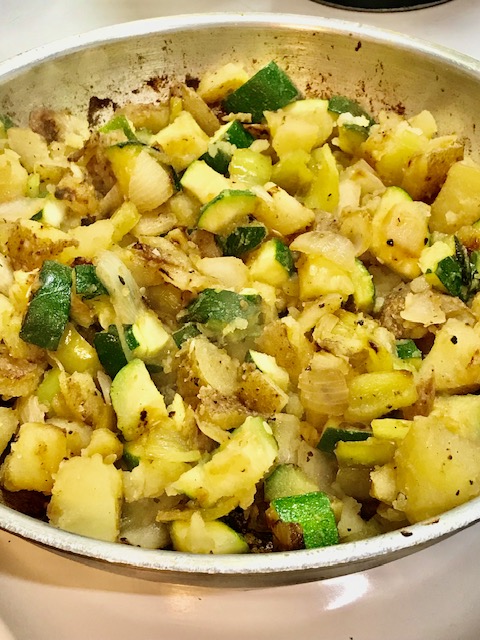 5- Add zucchini, stir easily into potatoes, even out in pan and cook till tender not mushy.