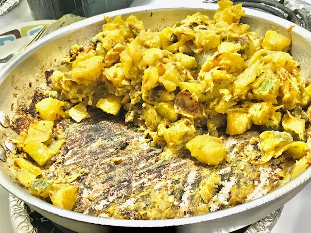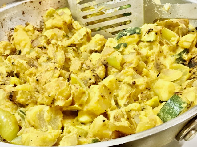 Pan-fired cubanelle peppers, sweet onion, yellow potatoes and zucchini, then tossed till coated with a mustard sauce! the zucchini adds a juicy component if done just right – tender, not mushy.