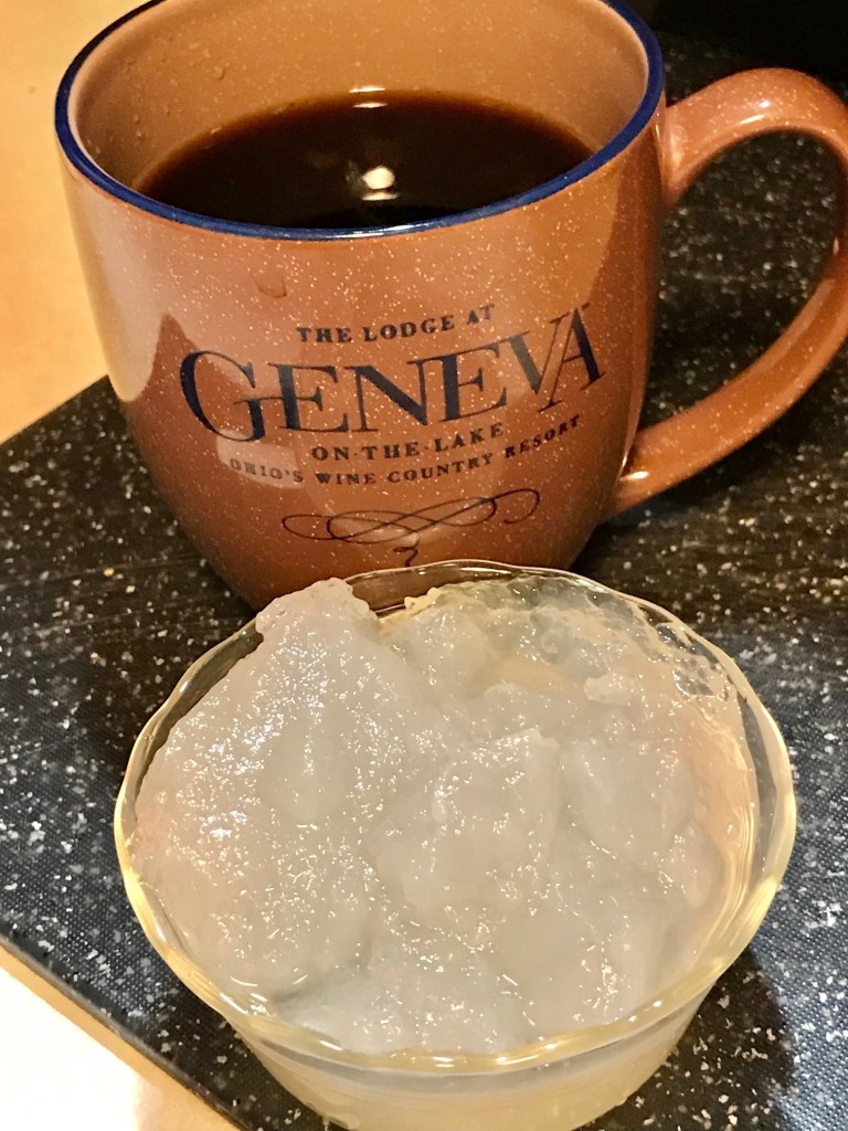 In the kitchen I fill a custard cup full of AGAR GEL. I eat with a spoon a couple heaping teaspoons, then put some in my coffee after it brews – about two Tablespoons. This gives the AGAR some time to coat my esophagus and stomach, since coffee gives me heartburn and I don’t take medicines for it, neither prescribed nor over-the-counter. The agar helps.