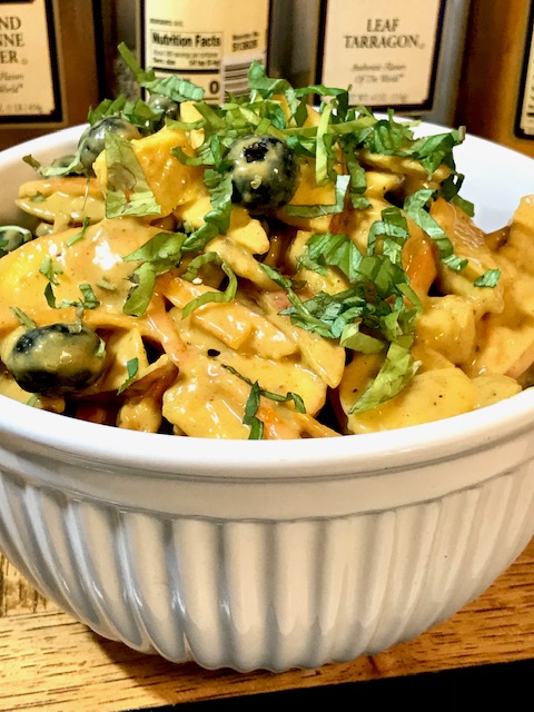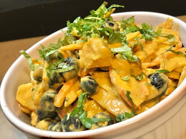People use dressings, sauces and condiments on just about everything they eat. So that’s an area we can work on in lowering the fat and caloric content of what we put on our food. Nobody would suspect that there is a fat-reduced creamy sauce enveloping the fresh fruits and rind matchsticks in this delectable salad!