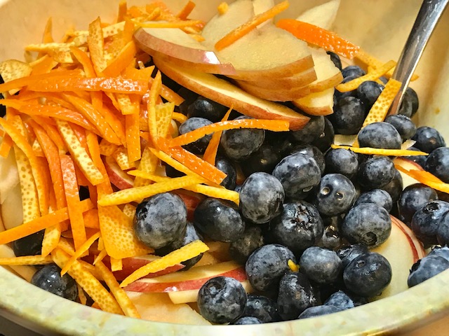 1- In extra-large bowl combine apples, oranges and rind matchsticks, blueberries, banana.