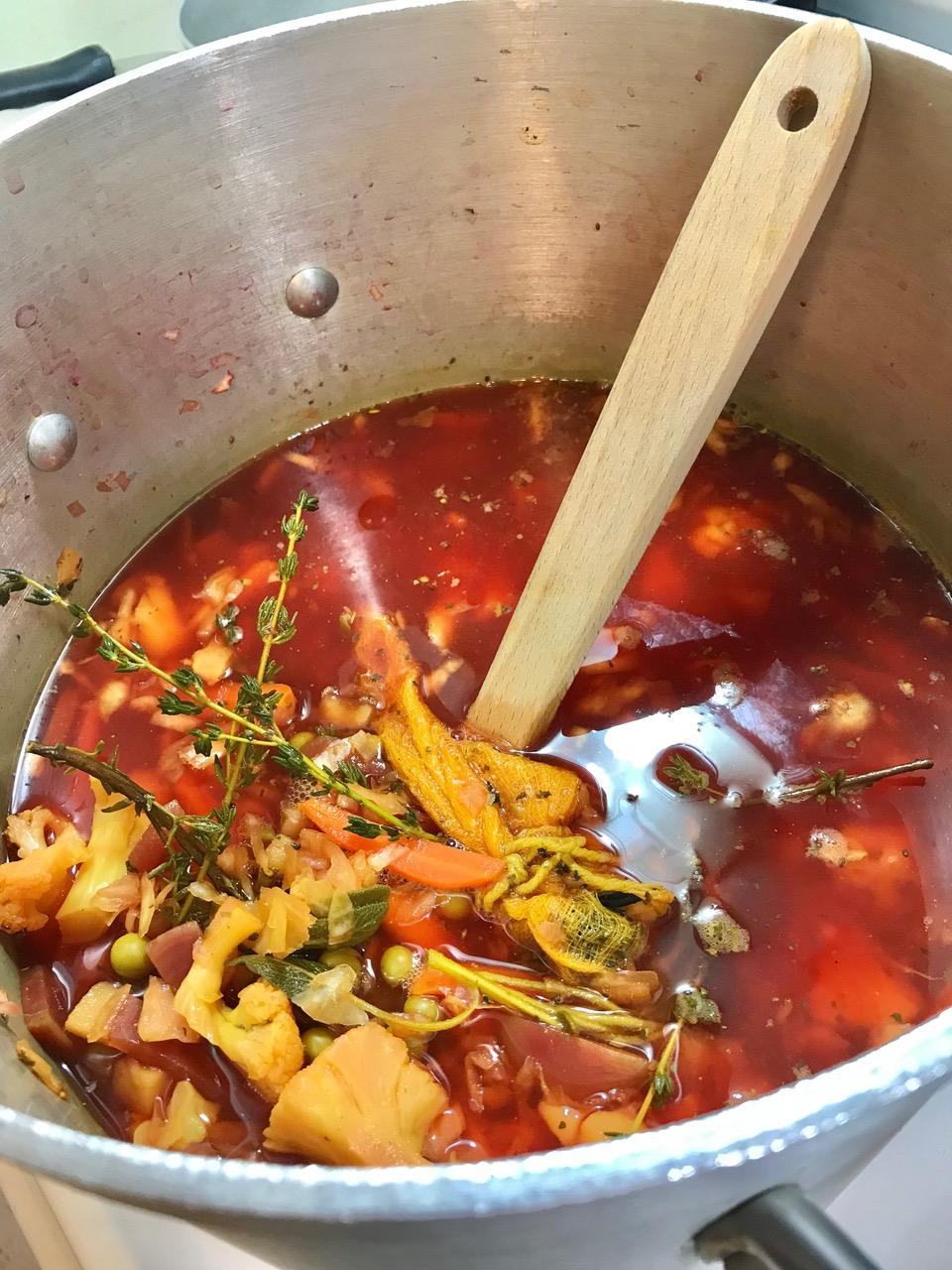 I scared Steve with the soup when he got up and I told him to go see it. ‘Nice color, he said. ‘Stir it, I said. ‘Nice. ‘Maybe I’ll thicken it a bit, I said. All of a sudden he started laughing and grabbed his chest bending over, then said, ‘Oh my God, I didn’t know what that was, then remembered that sachet thing – ‘that thing you talked about – the sachet thing. He took a deep breath and let it out like he just went through something. ‘Bouquet garni, I said as he continued to laugh.