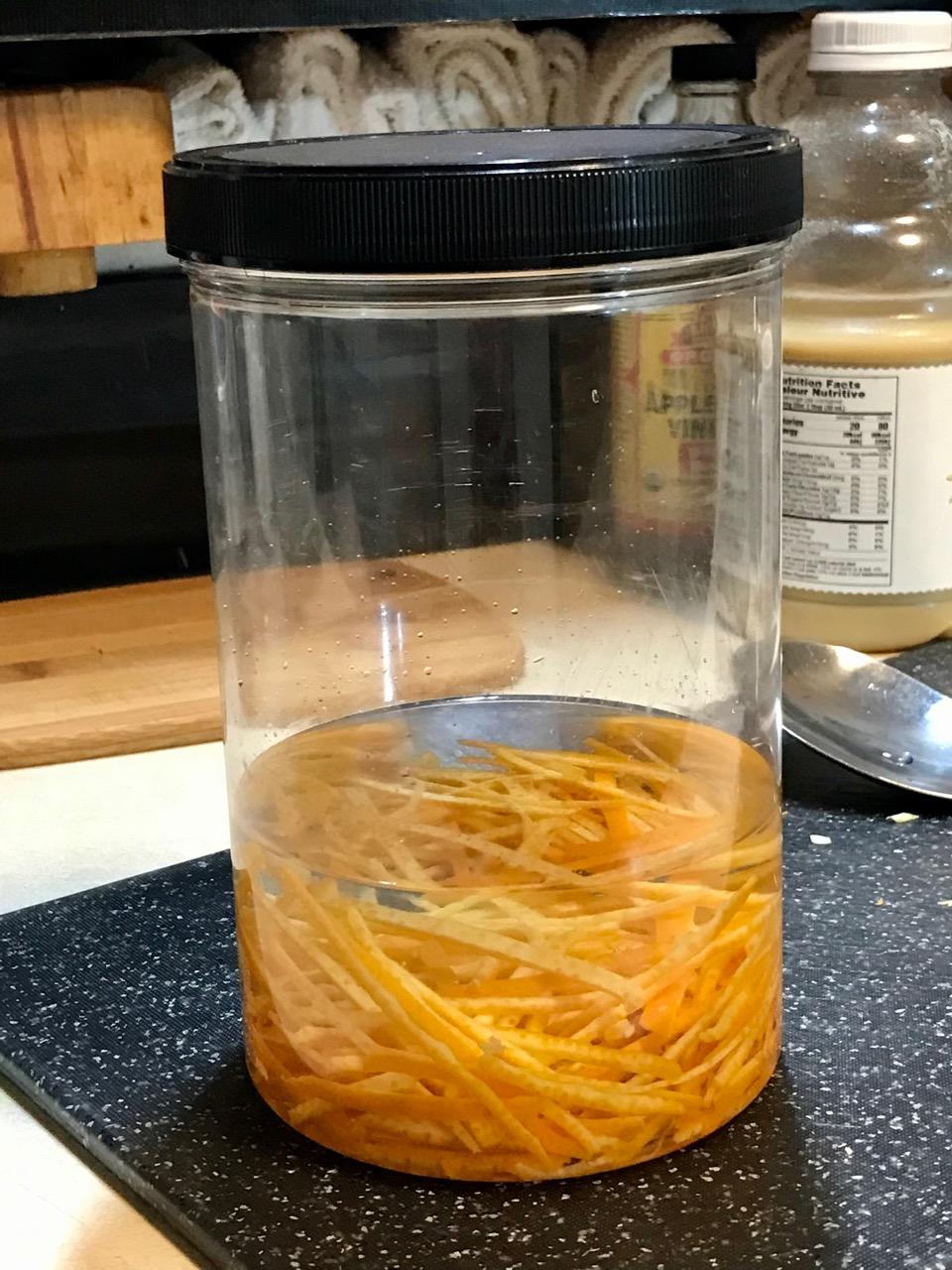 The flavor, however, of the orange rind was so strong and pleasurable, that now that’s what I’m going to do with any oranges he brings home. PICKLE THE THE RINDS – not your traditional pickling process, but just enough water and vinegar to retard spoilage when refrigerated.