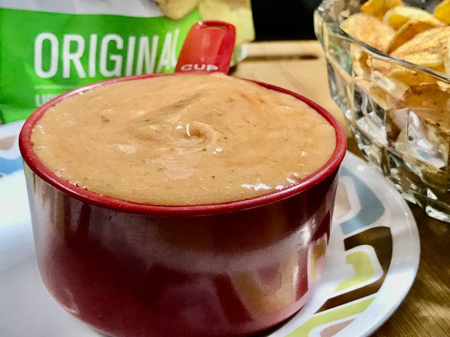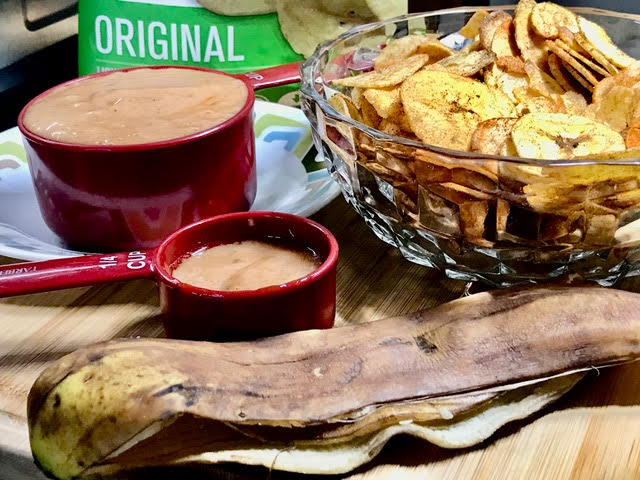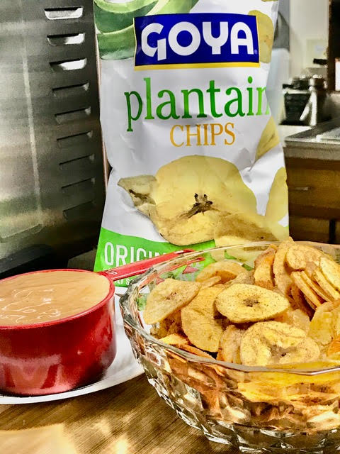GOYA PLANTAIN CHIPS served with a homemade BANANA HOT SAUCE. Ketchup with bananas in the same sauce?? You betcha’! Why always go with the old, when the new is just waiting to be discovered? Banana is old – ketchup is old – together is new! And you have a very high IQ – busting at the seams baby! Feeling contained?