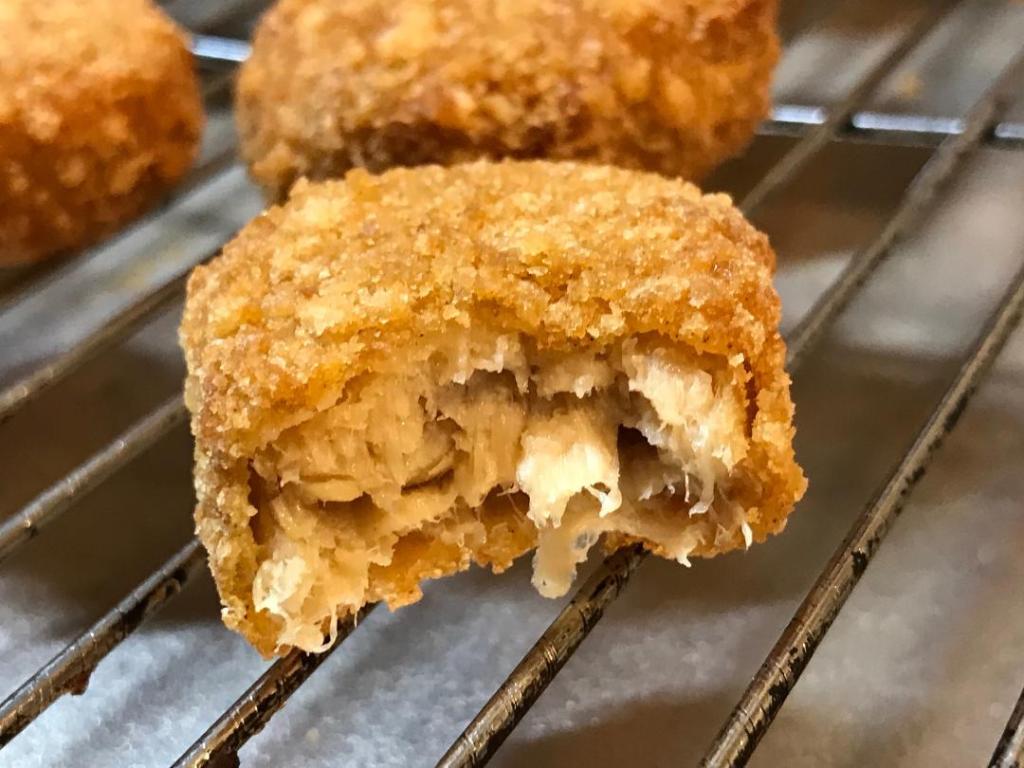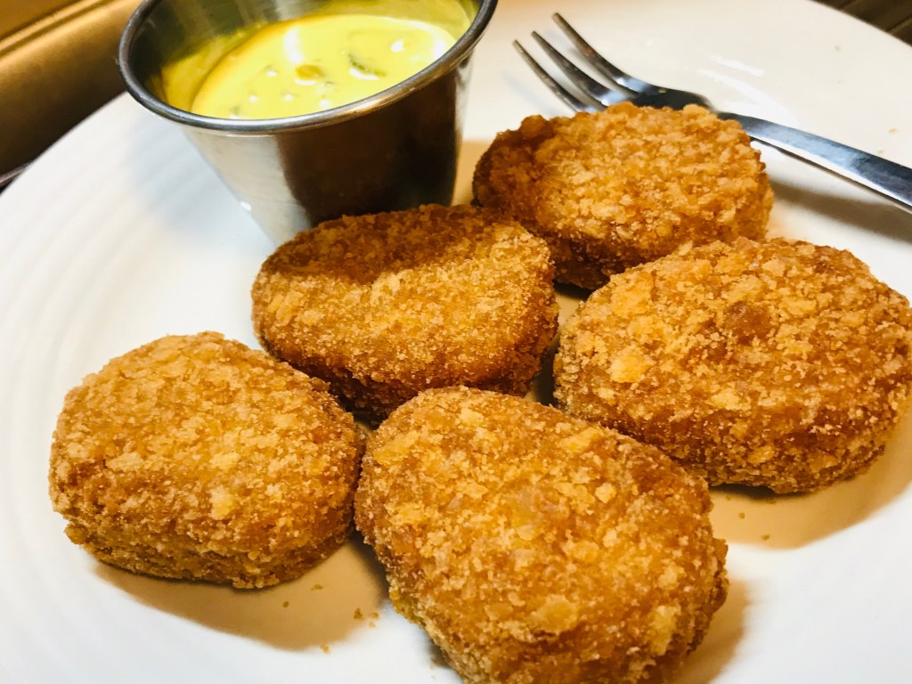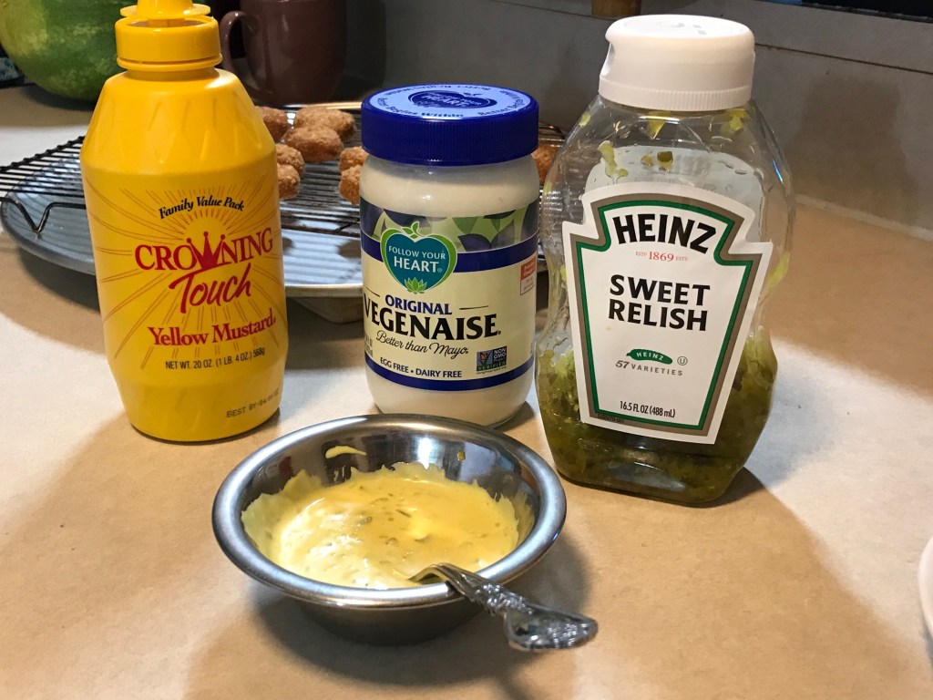 The dipping sauce gets the fat hammer too by adding equal amounts of A-F mayo by Follow Your Heart and prepared yellow mustard plus a little sweet relish to taste. Perfect with half the fat.