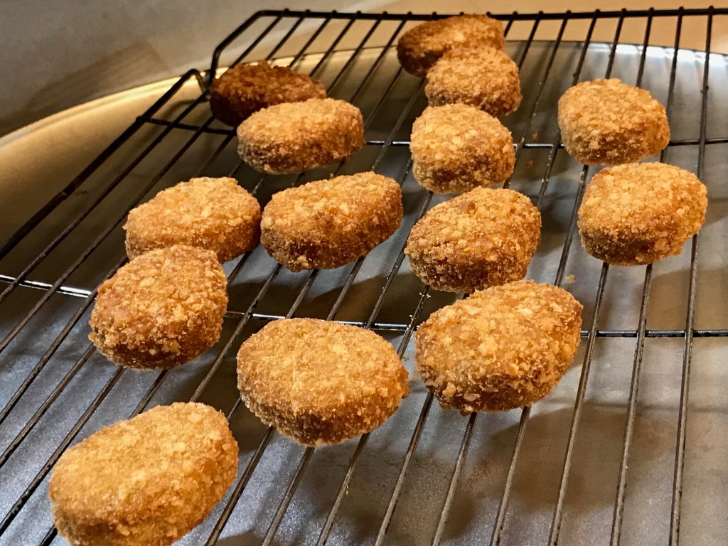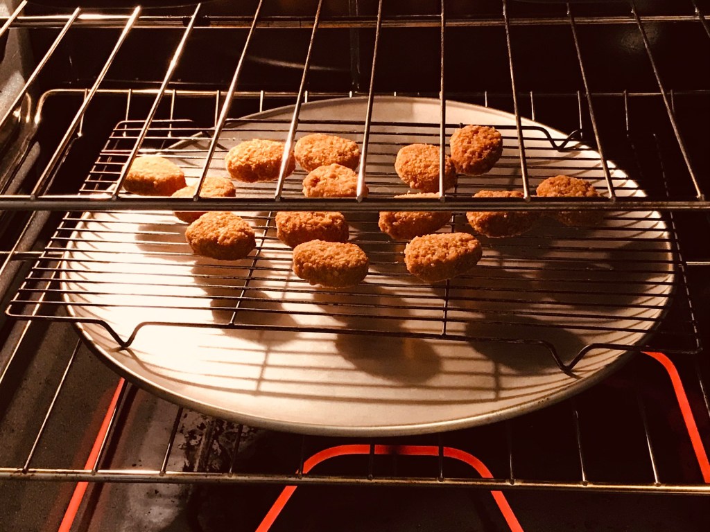 Truth is, although pan-fried is not recommended on the label, I prefer mine pan-fried in 2 Tablespoons extra virgin olive oil till crispy and hot (most of the oil stays in the pan, actually). To me the oil treats the breading better. To improve on the crispy part without the pan fry, I place a rack over the baking sheet and place the chik’n on the rack, so it basically air-fries. The oven fry is good, but a little dusty for my texture likes. So today I’m cutting the fat by going with the dusty fry in the oven – with a reduced fat dipping sauce for me – and Steve.