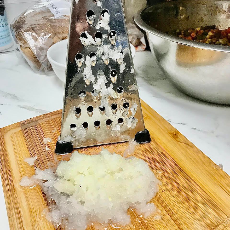 approx. 1/2 c. snowy onion – peel onion and grate over lg. holes of hand-held grater producing snow-like slush