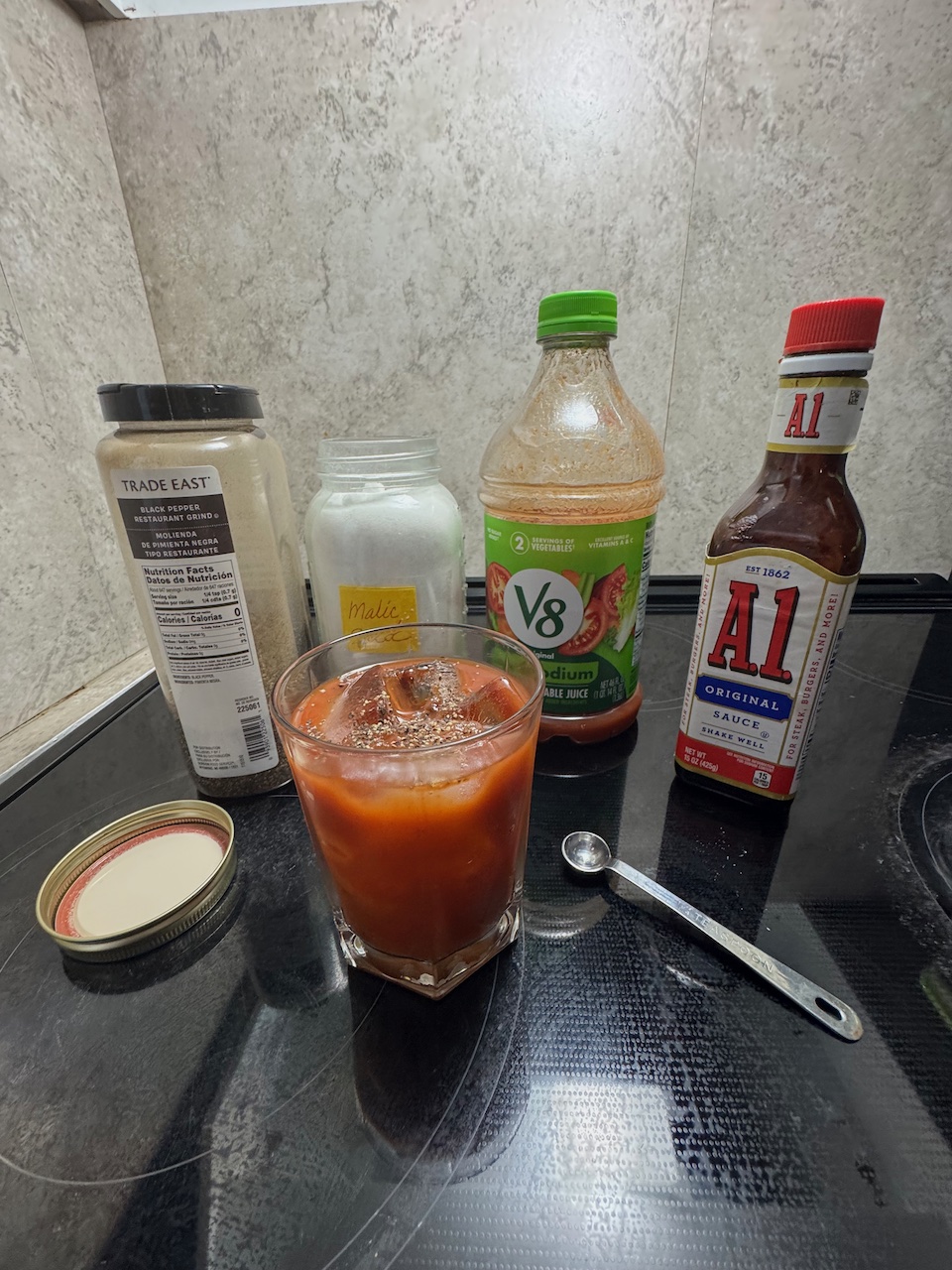 Pour V-8 in glass over ice.