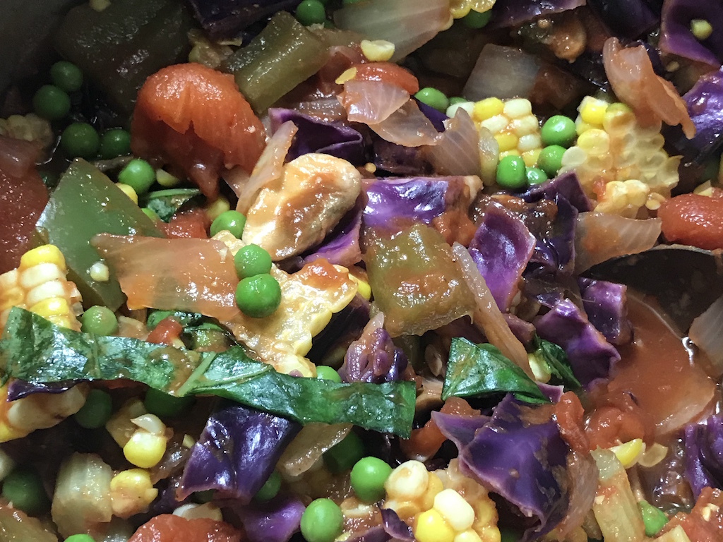 FRESH CORN VEGGIE POT Fresh corn mixed with red cabbage, mushroom, celery, onion and pepper saute, along with peas, fresh ginger sticks and garlic. San Marzano tomatoes turn this summer veg fest into a savory delight! Just what Steve asked for – healthy and delicious! Makes 17 cups 6 ears fresh corn-on-the-cob – cut endsContinueContinue reading “Fresh Corn Veggie Pot”